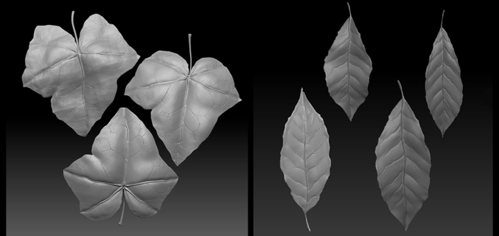 Next, it was time to start polishing my foliage and landscape. I created a grass landscape material in Substance Designer and applied it to my landscape actors. I experimented with two different methods for grass creation to see what I liked best. The first was a blocked-out grass patch in Maya and turned into a high poly in ZBrush. I exported it into Substance Designer for texture maps and created Small, Medium, and Large grass collections in SpeedTree. These worked really well to cover a lot of ground, and I ended up procedurally spreading them across my landscape actors to cover the bulk of the scene. Since it was a solid chunk already made in the texture maps, I lost some freedom when it came to making interesting shapes and silhouettes in SpeedTree. This inspired me to create a set of grass blades in Substance Designer, which I imported on a single texture map into SpeedTree. This allowed me to experiment with forces to get a much more unique clump of grass, which I hand-painted in my scene to break up the monotony of the original meshes. My ivy and bush leaves were sculpted in ZBrush and textured in Substance Painter. I imported this map into SpeedTree and set up my mesh cutouts for each individual leaf type. I assembled my foliage in SpeedTree using my completed modular kit to grow the ivy along the surfaces, so that it looked like it grew naturally when placed in my scene.