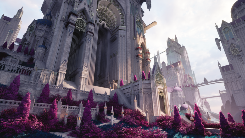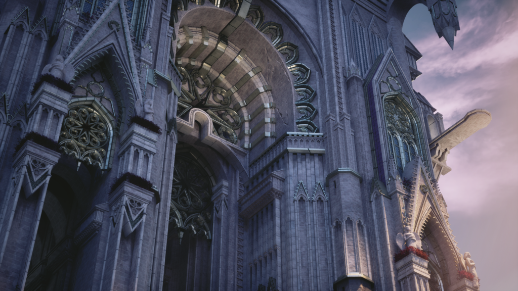 Finally, after I was confident with the rest of my scene, I wanted to have intentional control over the colors and lighting. To achieve this, I created a custom LUT in Photoshop using a screenshot of my environment and some smart filters. This allowed me to choose what colors to highlight and do a final pass on unifying my scene’s color palette. Throughout the entire process, I made sure to check my scene through my camera actors for all my different shots to make sure the compositions remained visually pleasing, making small tweaks here and there to suit each shot. I added the god rays highlighting the entrance to the castle, and I felt they really completed the environment!