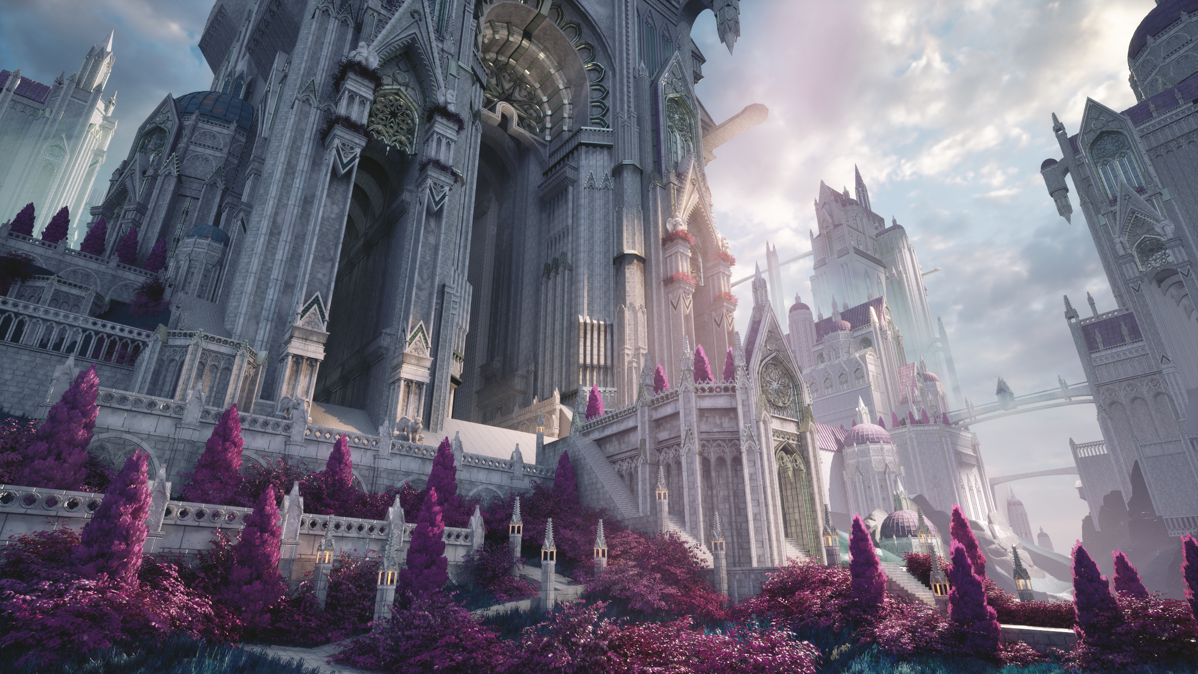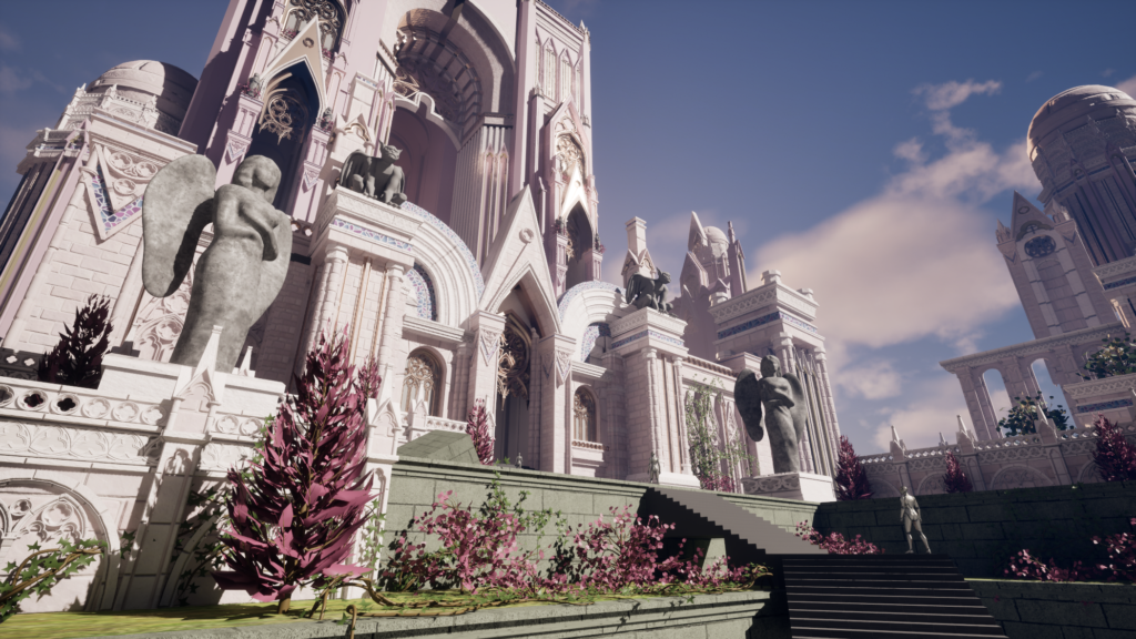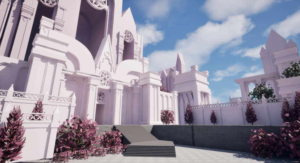 For my Vessel Forge project, I wanted to create a scene that would stand out from my current portfolio pieces and add variety to my portfolio. I was looking for something bright, colorful, and with plenty of opportunities for me to practice my sculpting skills. I settled on a concept piece, and my first step was to gather references. I focused on how I want my materials to read, foliage, and real-life cathedrals. I also began to study the concept and decide how I wanted to split the scene up into a modular kit.