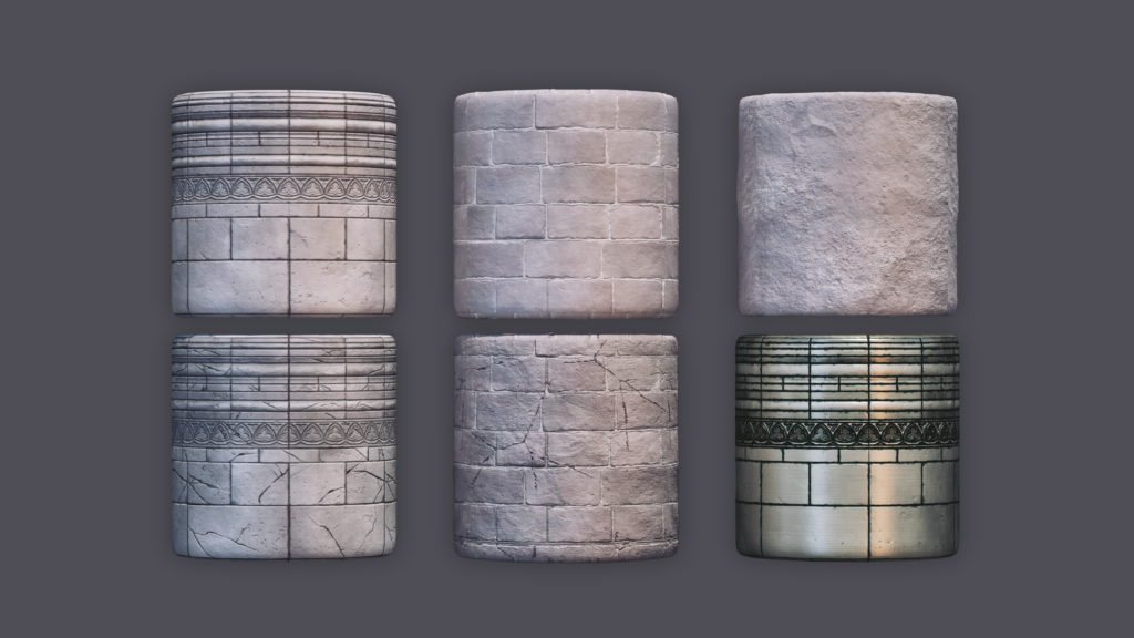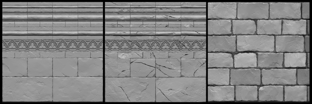 During the modeling phase, I also started sculpting my tiling bricks and my trim sheet. Sculpting my heightmap was a completely new workflow to me, so one of my main goals during this project was to practice my sculpting skills. I started with a sketch of my trim sheet, which I then made basic blockout models of in Maya and imported into ZBrush. From there I sculpted the stones and created a damaged version that I could vertex paint onto my buildings. For the bricks, I sculpted six different bricks and arranged them on a plane before doing a second sculpting pass to differentiate them. All of these sculpts were exported through a ZGrab and imported into Substance Designer to generate the final texture maps.
