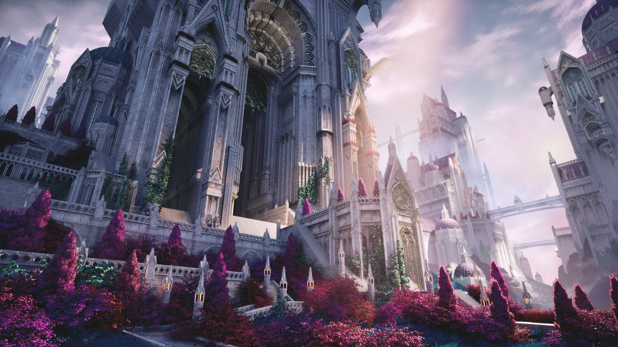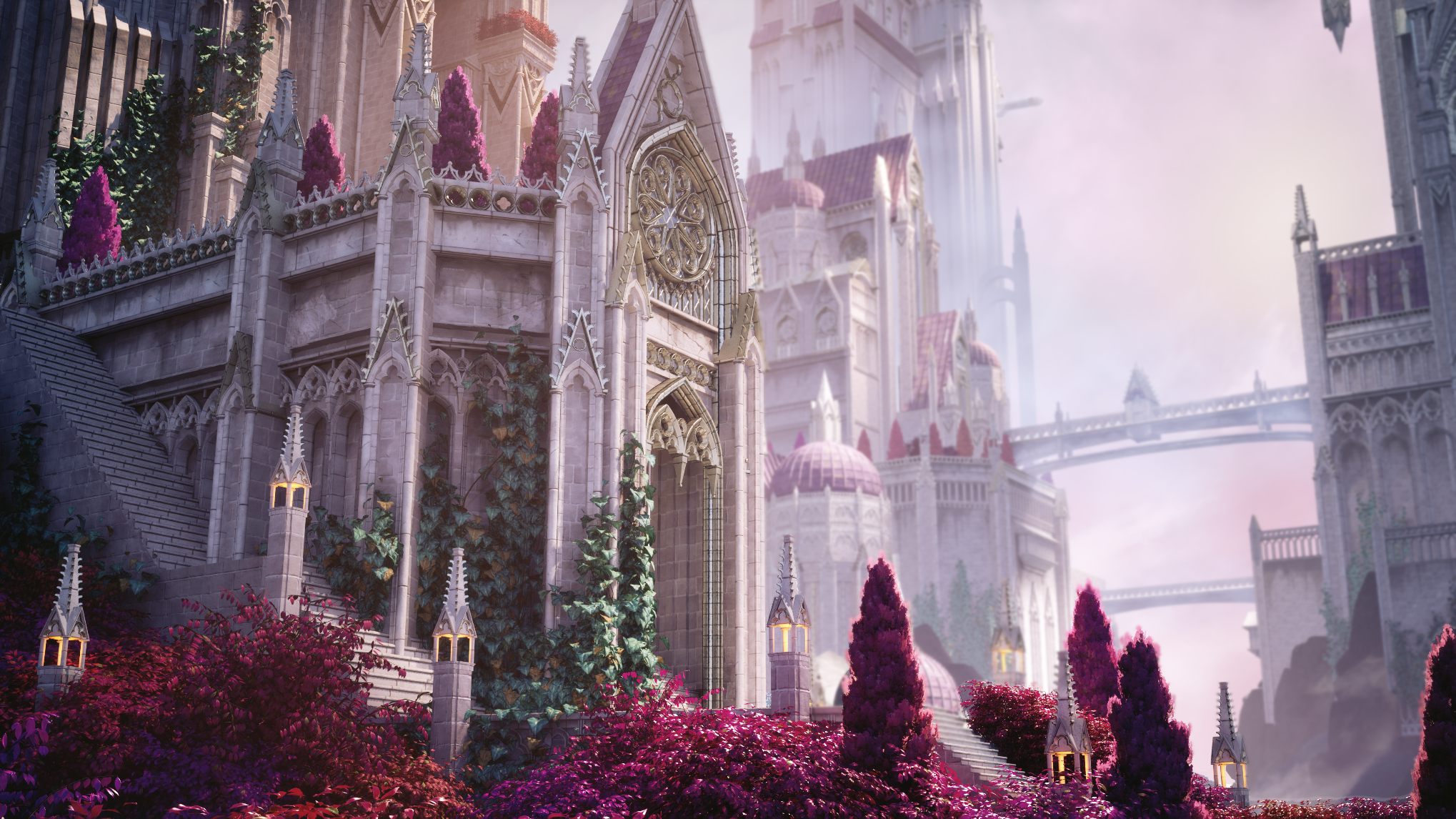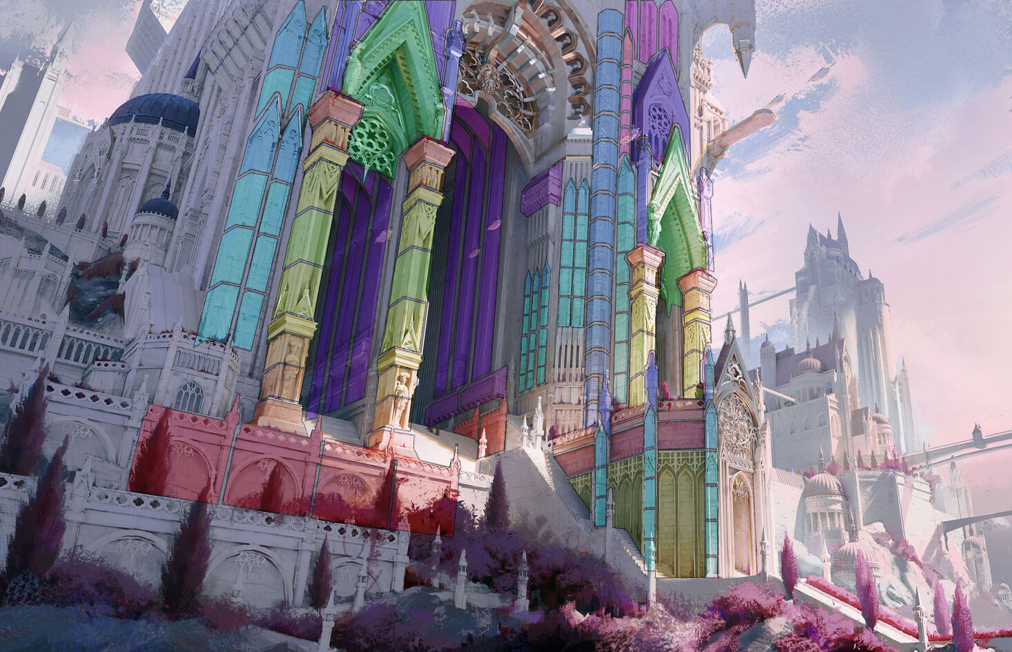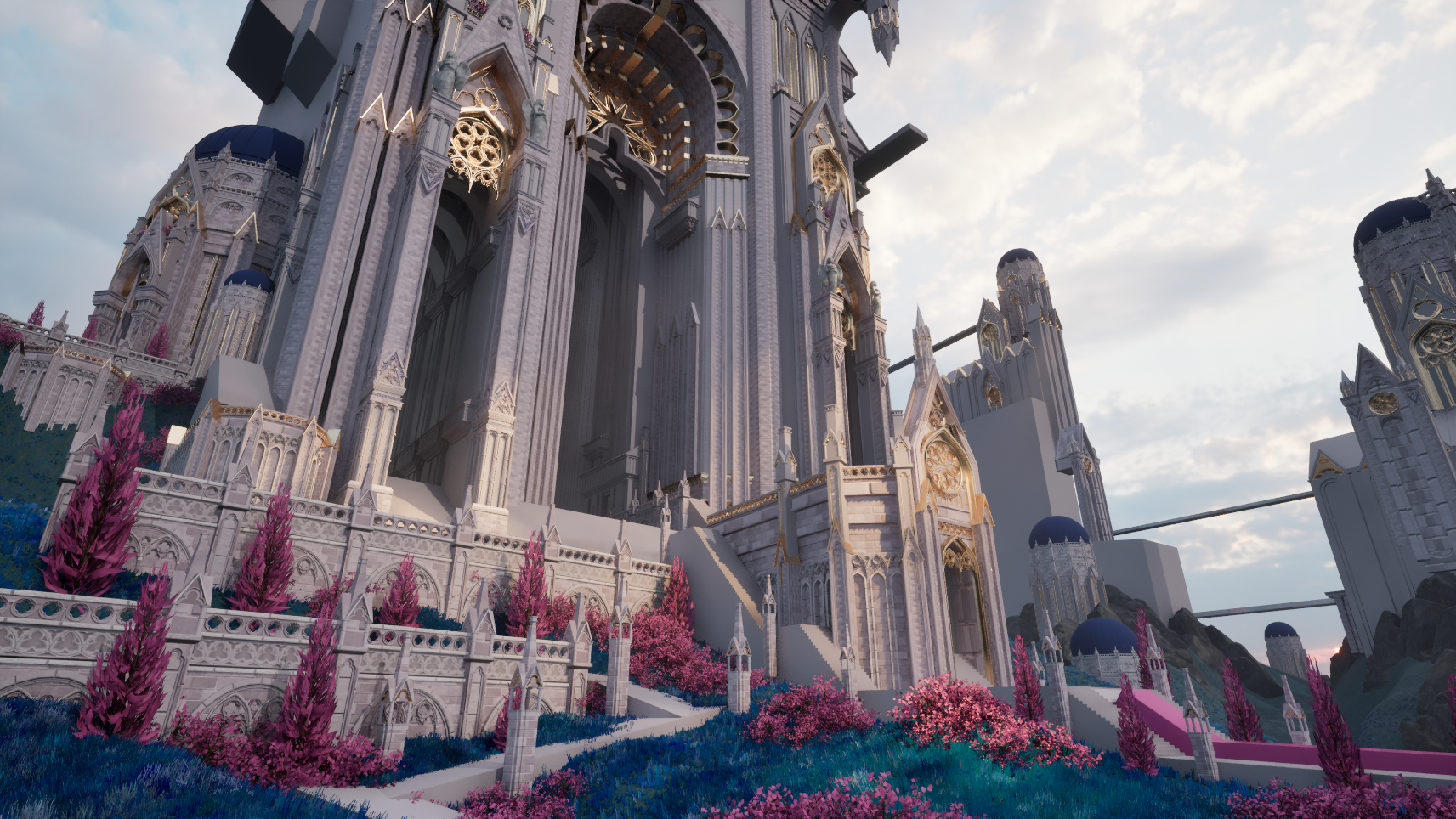 For my Vessel Forge project, I wanted to create a scene that would stand out from my current portfolio pieces and add variety to my portfolio. I was looking for something bright, colorful, and with plenty of opportunities for me to practice my sculpting skills. I settled on a concept piece, and my first step was to gather references. I focused on how I want my materials to read, foliage, and real-life cathedrals. I also began to study the concept and decide how I wanted to split the scene up into a modular kit.