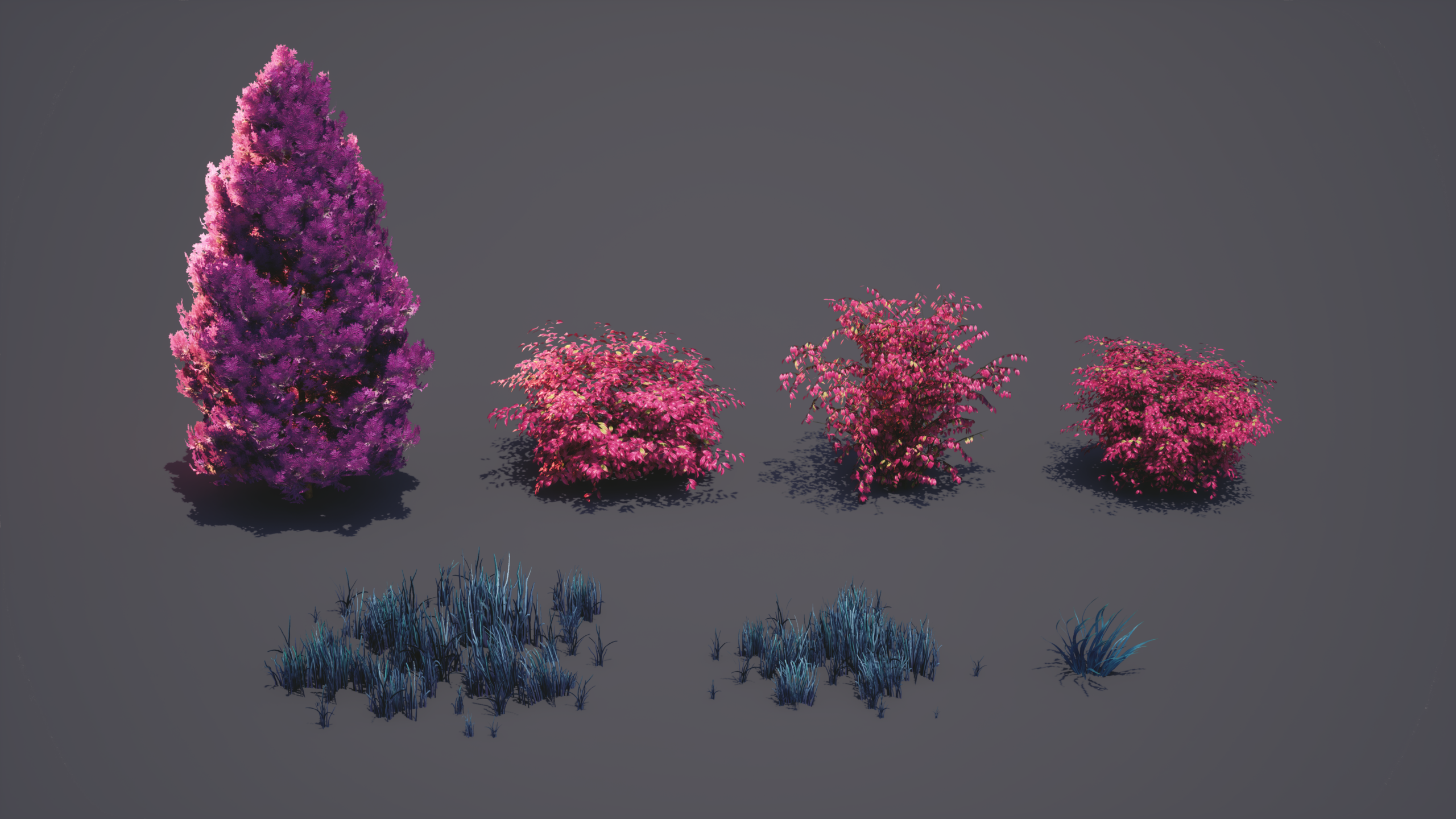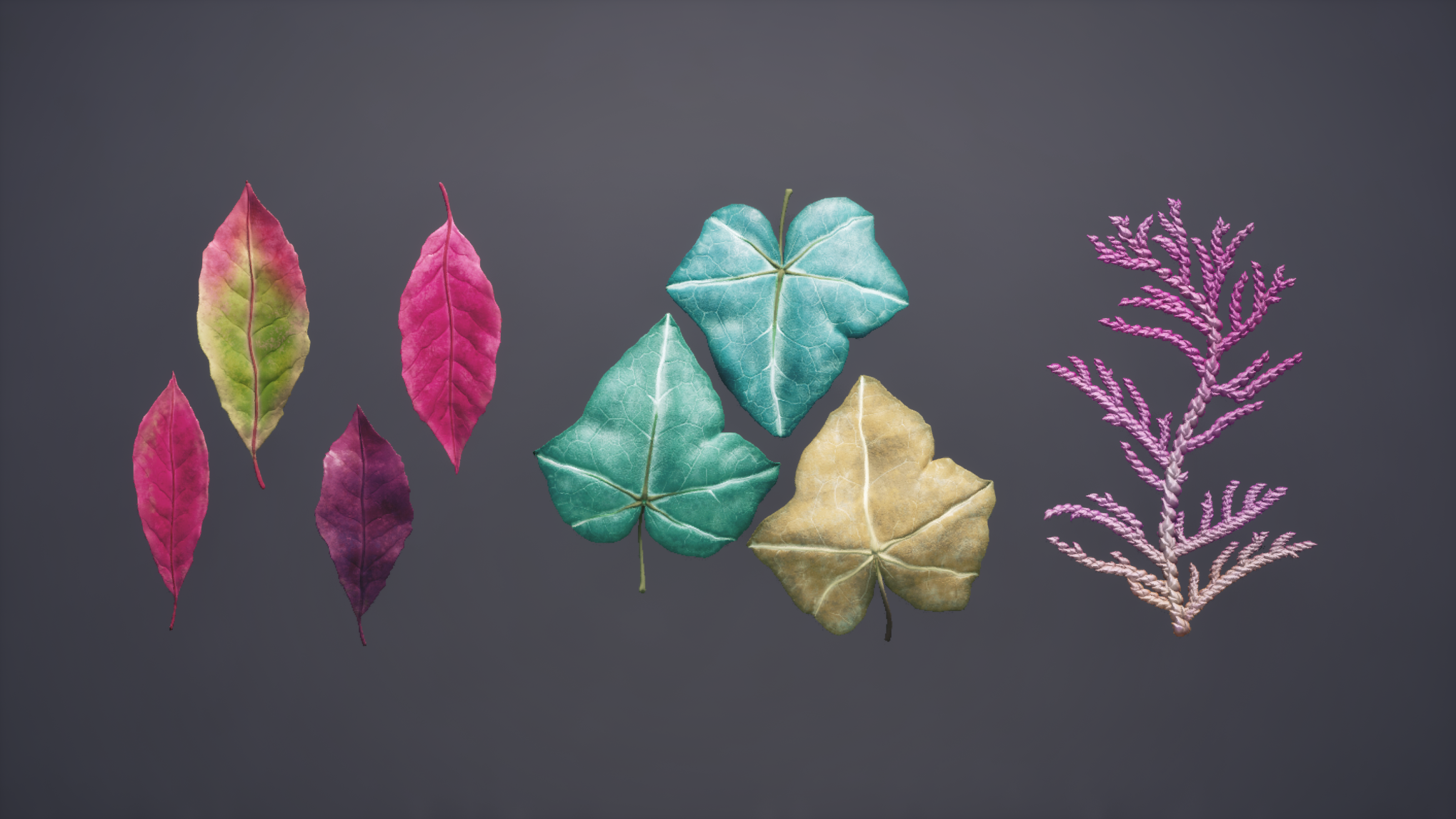 Next, it was time to start polishing my foliage and landscape. I created a grass landscape material in Substance Designer and applied it to my landscape actors. I experimented with two different methods for grass creation to see what I liked best. The first was a blocked-out grass patch in Maya and turned into a high poly in ZBrush. I exported it into Substance Designer for texture maps and created Small, Medium, and Large grass collections in SpeedTree. These worked really well to cover a lot of ground, and I ended up procedurally spreading them across my landscape actors to cover the bulk of the scene. Since it was a solid chunk already made in the texture maps, I lost some freedom when it came to making interesting shapes and silhouettes in SpeedTree. This inspired me to create a set of grass blades in Substance Designer, which I imported on a single texture map into SpeedTree. This allowed me to experiment with forces to get a much more unique clump of grass, which I hand-painted in my scene to break up the monotony of the original meshes. My ivy and bush leaves were sculpted in ZBrush and textured in Substance Painter. I imported this map into SpeedTree and set up my mesh cutouts for each individual leaf type. I assembled my foliage in SpeedTree using my completed modular kit to grow the ivy along the surfaces, so that it looked like it grew naturally when placed in my scene.