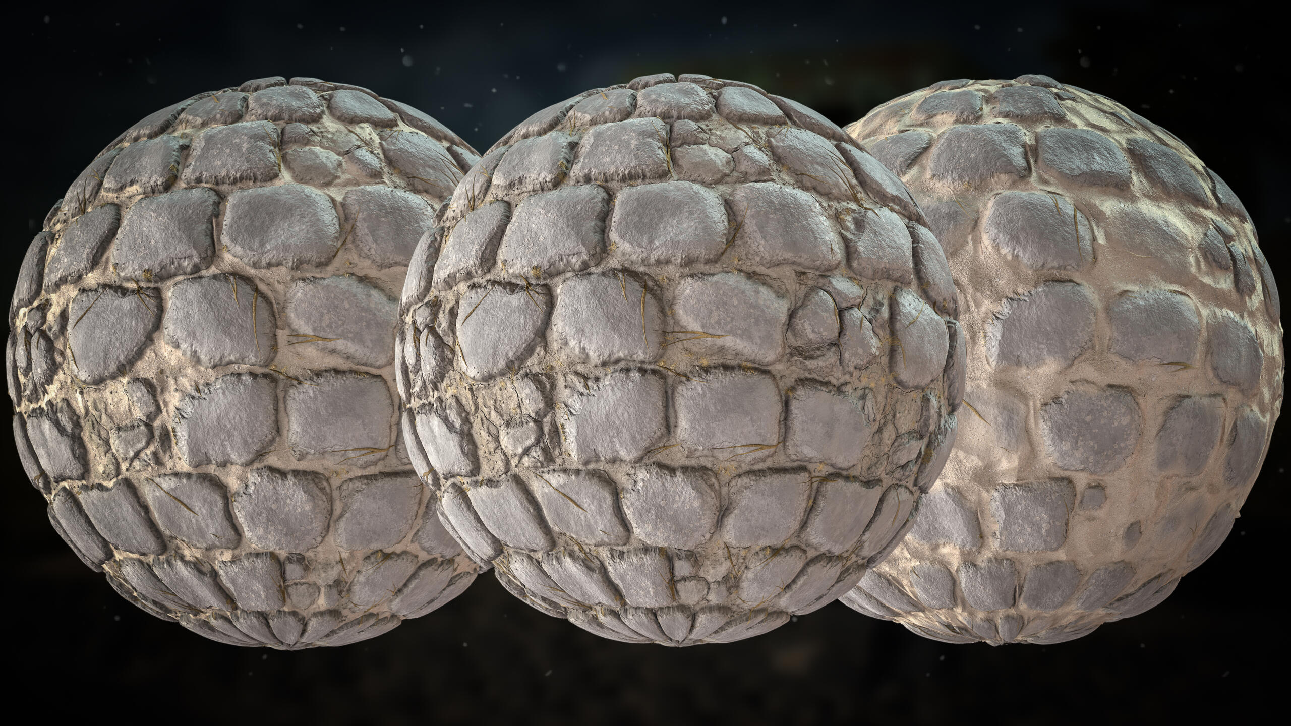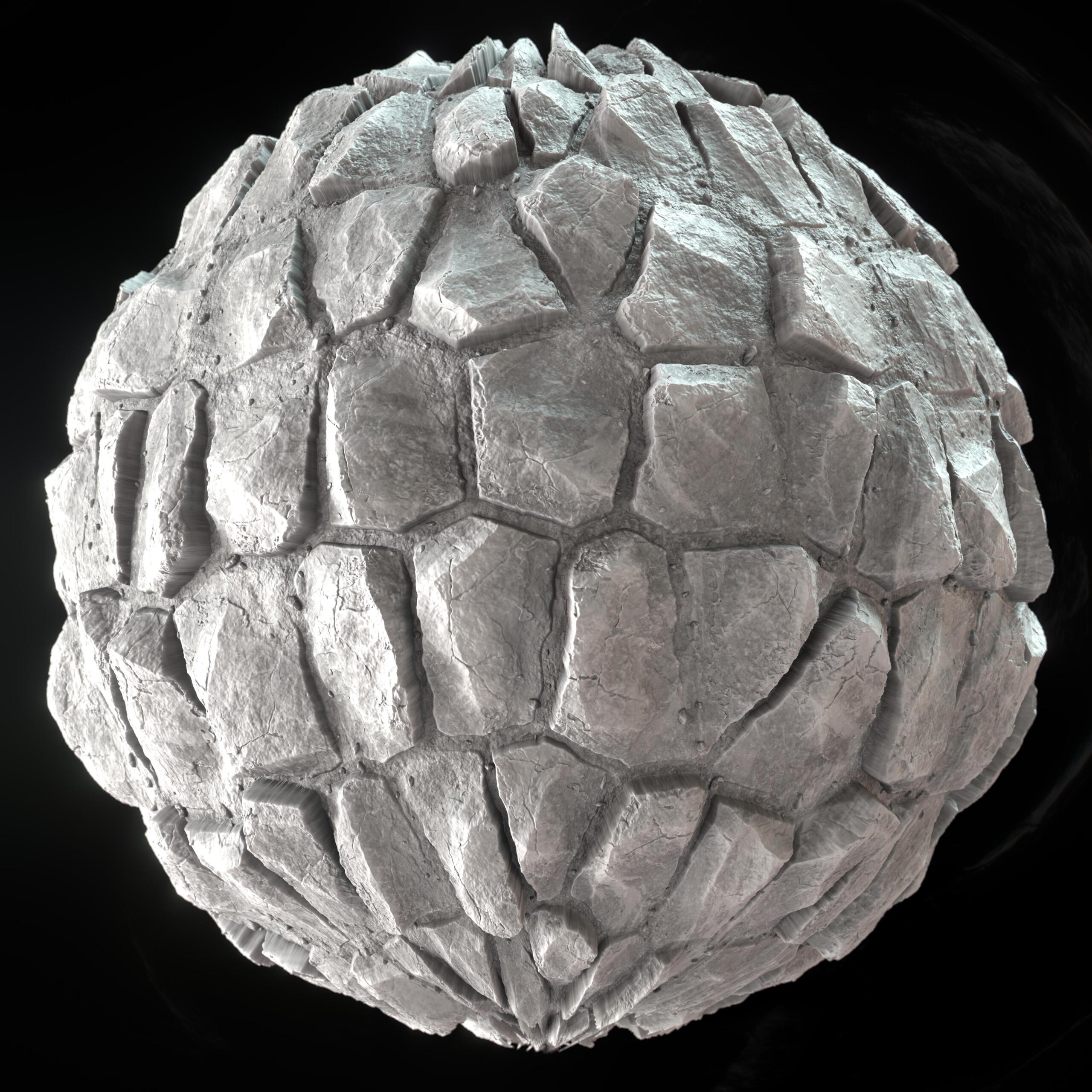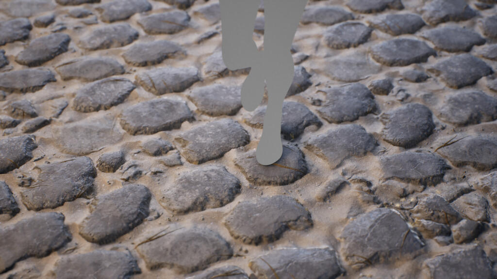 Previously, most stones were similar in size. That uniformity subtly broke believability. Real stone pavements contain scale variation, larger structural blocks, medium stones, and smaller fillers.