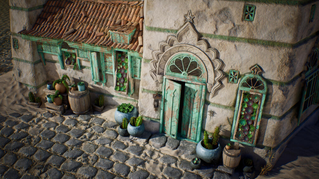 Instead of sculpting five separate cacti, I generated them parametrically and relied on instancing inside Unreal to keep memory controlled. Roughly ten unique base meshes were sufficient to populate the environment convincingly.