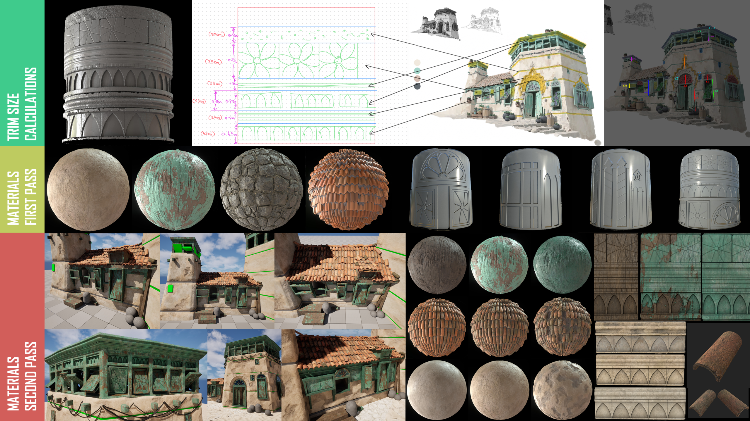 The trims were planned using a 200cm reference mapped to a 2K texture, roughly ~1024px per meter. This became the baseline for the entire project. Every trim, every tileable surface adhered to that density. Consistency here was critical. If one surface deviates, the illusion breaks.