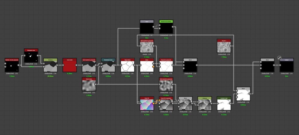 The 18 materials were not isolated graphs. At the core of the project was a centralized base material in Substance Designer. This base is defined: