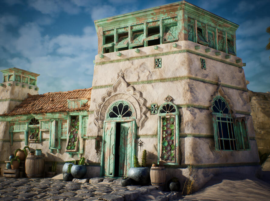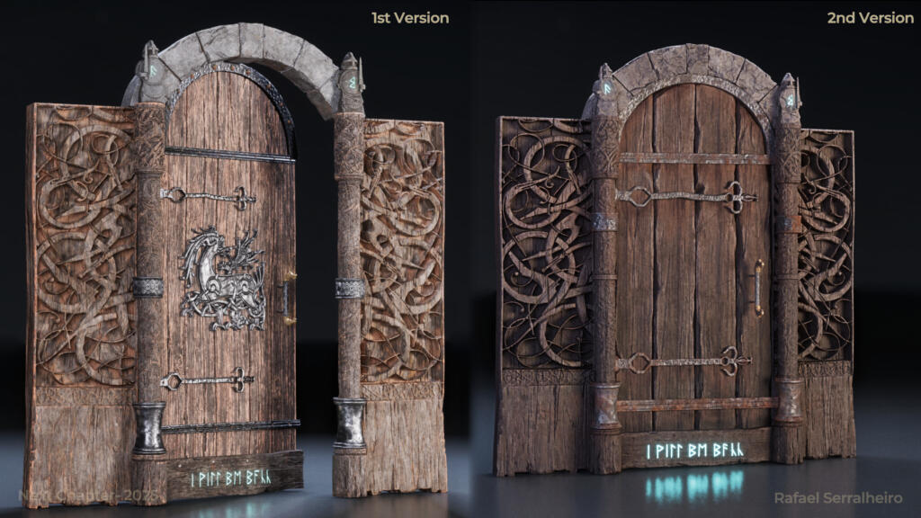 To improve readability, I pulled back on the high-frequency noise and focused more on strong primary and secondary shapes—adding clearer cuts and breaks in the wood so the design read more cleanly at a glance. This simplification ultimately benefited the entire composition: the door became a more focused hero asset and created better visual balance with the scene around it.