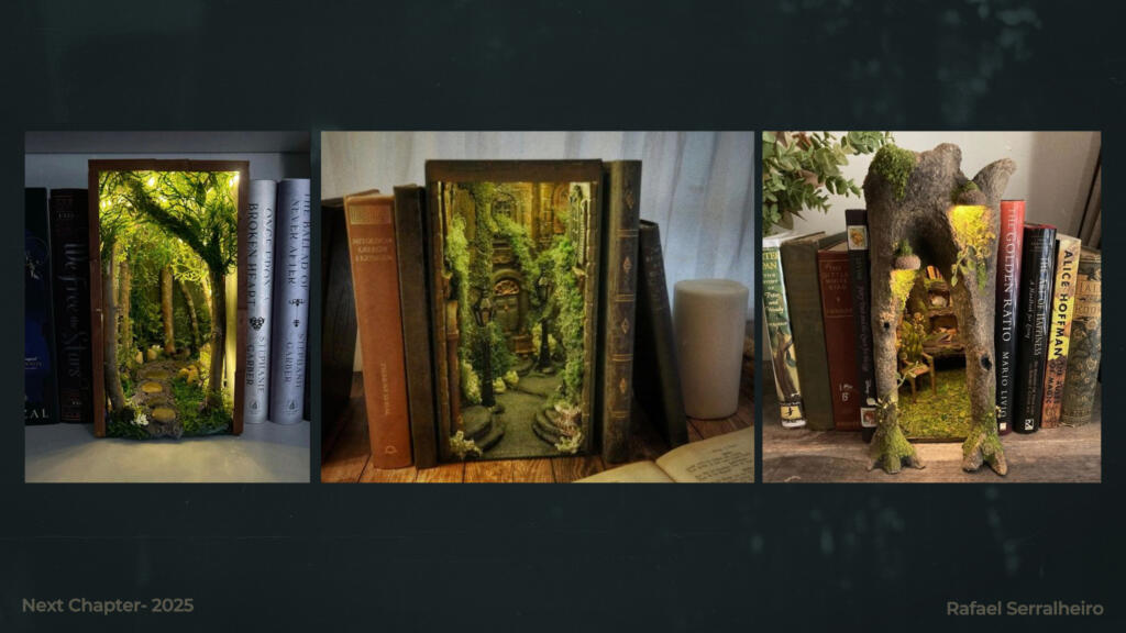 The concept was inspired by shelf decorations featuring tiny “mini-world” scenes and often framed between two books, as in the reference image below. I also wanted the door to feel like a portal to another realm, so I designed the central area to read as a cave entrance.