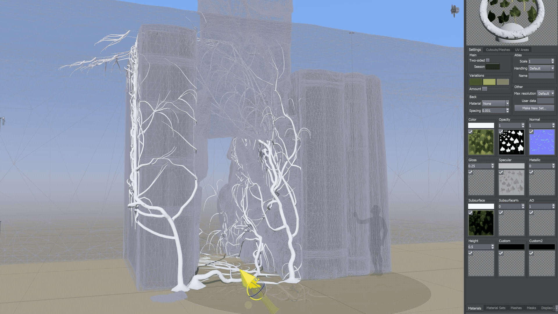 Creating the vines for this project was an excellent opportunity to explore new ways of working in SpeedTree, since I hadn’t used it very deeply before. Vines are a perfect candidate for procedural creation, and because this was a personal project, I treated them as a one-off asset rather than building them as a modular set.