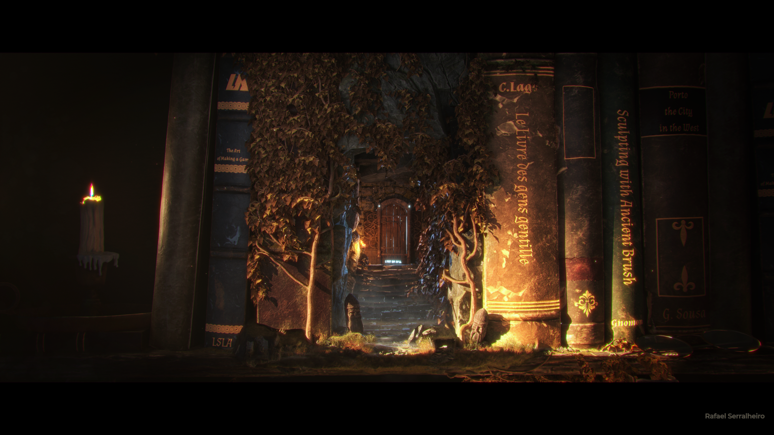 As I continued building the environment, I felt the scene also needed vegetation to break up the sharp, rigid edges of the books and create a more organic, natural frame around the door.