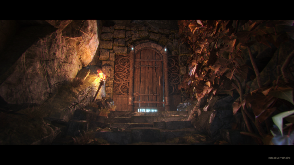 This scene came with several challenges, but lighting was by far the biggest one—and the aspect that changed the most throughout production. Because the composition is relatively flat, I needed lighting to create contrast and guide the viewer’s eye, while still keeping the central area readable so the door and cave entrance remained the focus.